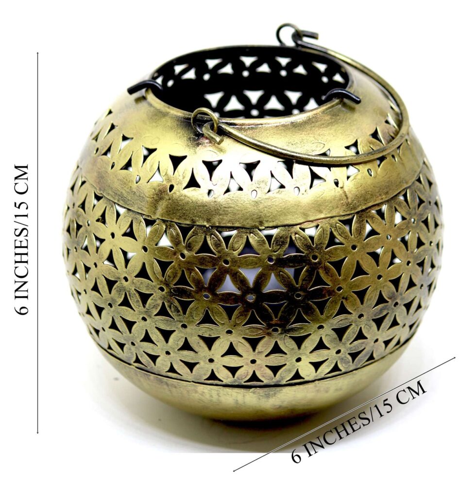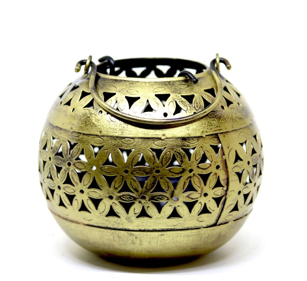 The image depicts two decorative brass bowls with handles, sitting on a table. The bowls have a floral design etched on their surface.
