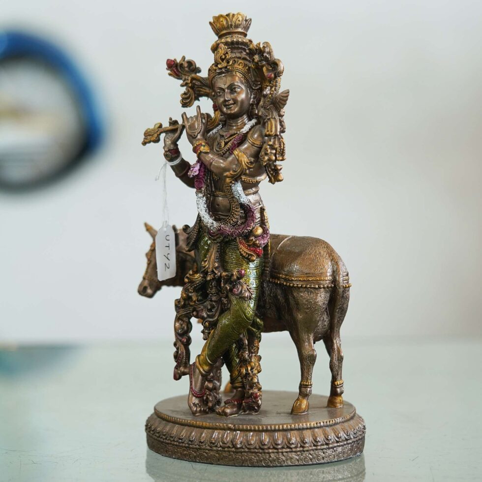 This bronze statue depicts the Hindu god Krishna playing his flute alongside a cow. Krishna is a popular deity in Hinduism, known for his love, compassion, and playfulness. The cow is considered a sacred animal in Hinduism and symbolizes purity, innocence, and abundance. This statue is a beautiful and meaningful representation of Krishna’s divine love and connection to all living beings.